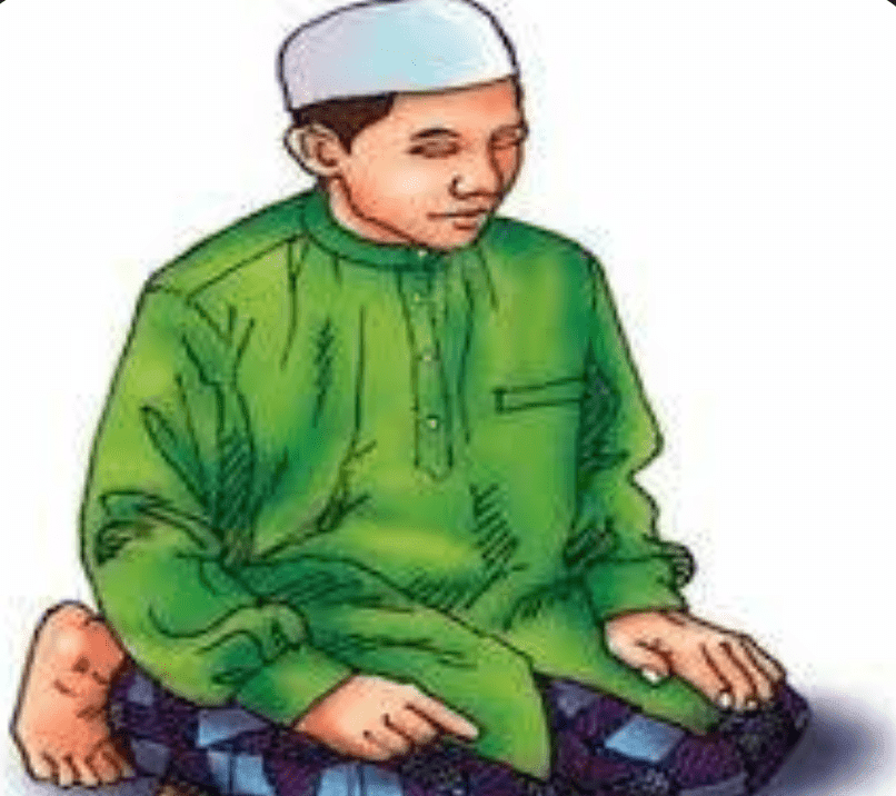 "..., kemudian Rasul duduk, lalu beliau menggelarkan kaki kirinya dengan meletakkan telapak tangan kirinya atas paha dan lutut kiri dan menjadikan ujung siku kanan di atas paha kanan. Beliau menggenggamkan dua dari anak jarinya (kelingking dan jari manis) dan membuat gelungan (menggelungkan ibu jari kepada jari tengah), lalu beliau menggerak-gerakkan anak jari (telunjuk). Aku that beliau menggerakkannya seraya berdoa." (HR. Ahmad, An-Nasa'y dan Abu Daud; Al-Muntaga 1: 448)760) Ibnu Umar ra, berkata: